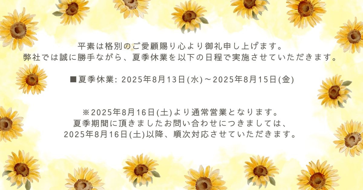 夏季休業のお知らせ 2025.11.02 2025.11.30 お知らせ ゴールデンウィーク休業のお知らせ 前の記事 2025年11月23日(日)~11月24日(月)研修の為休業させていただきます。 次の記事