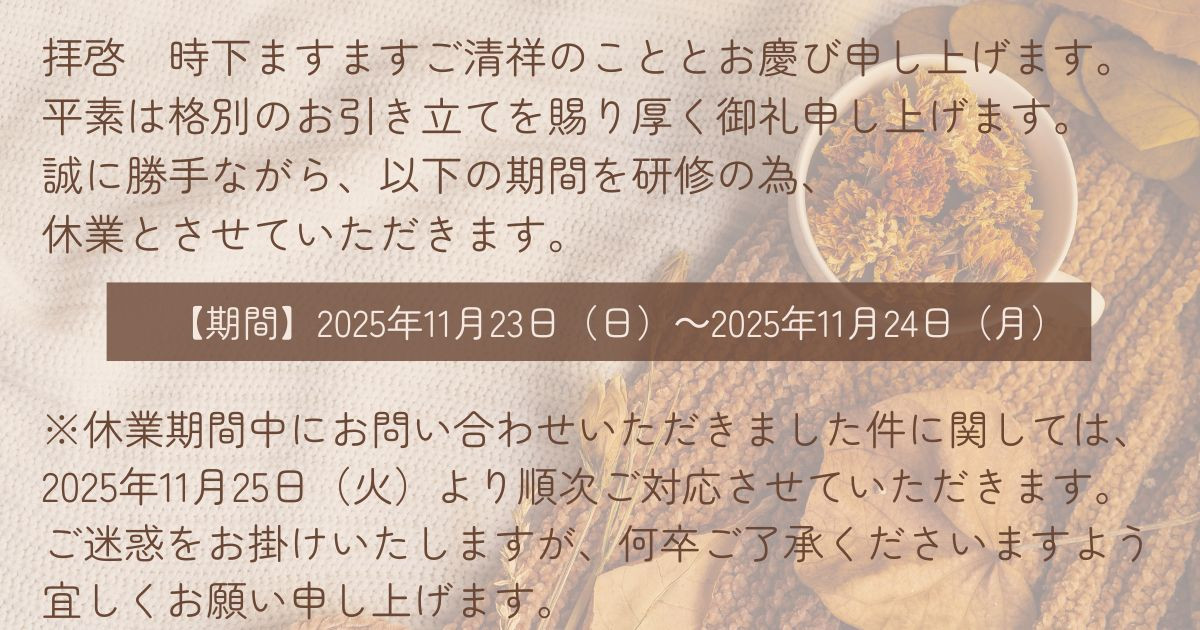 2025年11月23日(日)~11月24日(月)研修の為休業させていただきます。 2025.11.02 2025.11.30 お知らせ 夏季休業のお知らせ 前の記事 ホームページをリニューアルしました。 次の記事